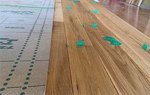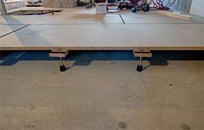 フローリングを貼る前の大事な作業がスラブ床と呼ばれるコンクリートの床とフローリングを貼る間に遮音を確保する為の下地を施工しなくてはなりません。これの遮音等級を確保できる商品であるか、傾きが無い様にレベルが取れているかチェックを行います。